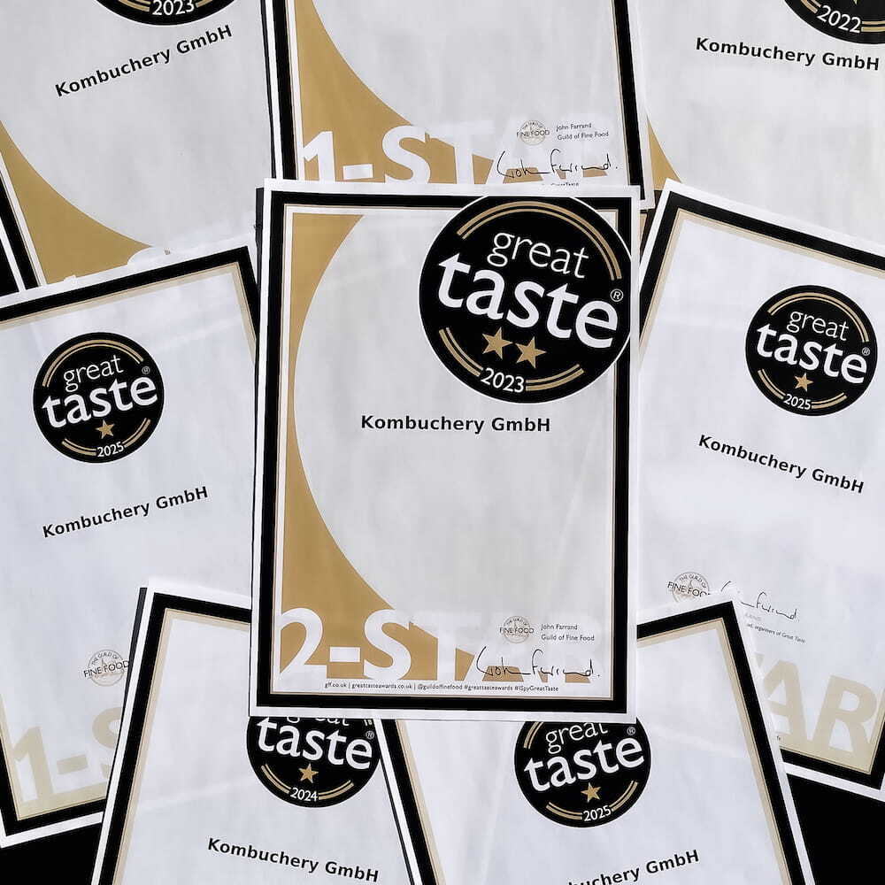 Unser Kombucha wurde bereits achtfach mit dem renommierten Great Taste Award ausgezeichnet – einem der weltweit anerkanntesten Qualitätssiegel in der Lebensmittel- und Getränkeindustrie. Der Great Taste Award wird von einer unabhängigen Jury aus über 500 Experten verliehen, die Produkte nach Geschmack, Qualität und Innovation bewerten. Nur die besten Produkte erhalten diesen Preis, und wir sind stolz darauf, dass unser Kombucha zu den ausgezeichneten Getränken gehört. Diese Auszeichnung bestätigt nicht nur den hervorragenden Geschmack, sondern auch die hohe Qualität, die in jeder Flasche Kombuchery steckt.