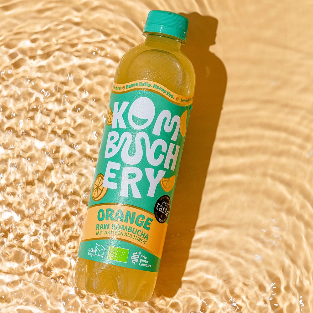 Natürlich können wir dir nicht das genaue Geheimrezept verraten, aber wir möchten transparent erklären, was dahinter steckt: Wir setzen auf einen mehrstufigen Fermentationsprozess, bei dem wir genau auf die natürlichen Abläufe achten. Der Zucker wird dabei nahezu vollständig verstoffwechselt und möglicher Alkohol bereits im Prozess wieder abgebaut. Mit unter 2,3 g Zucker pro 100 ml enthält unser Kombucha über 60 % weniger Zucker als die meisten anderen – das macht ihn nicht nur leichter und gesünder, sondern nimmt den Mikroorganismen auch die Nährstoff-Grundlage für eine ungewollte Weitergärung.